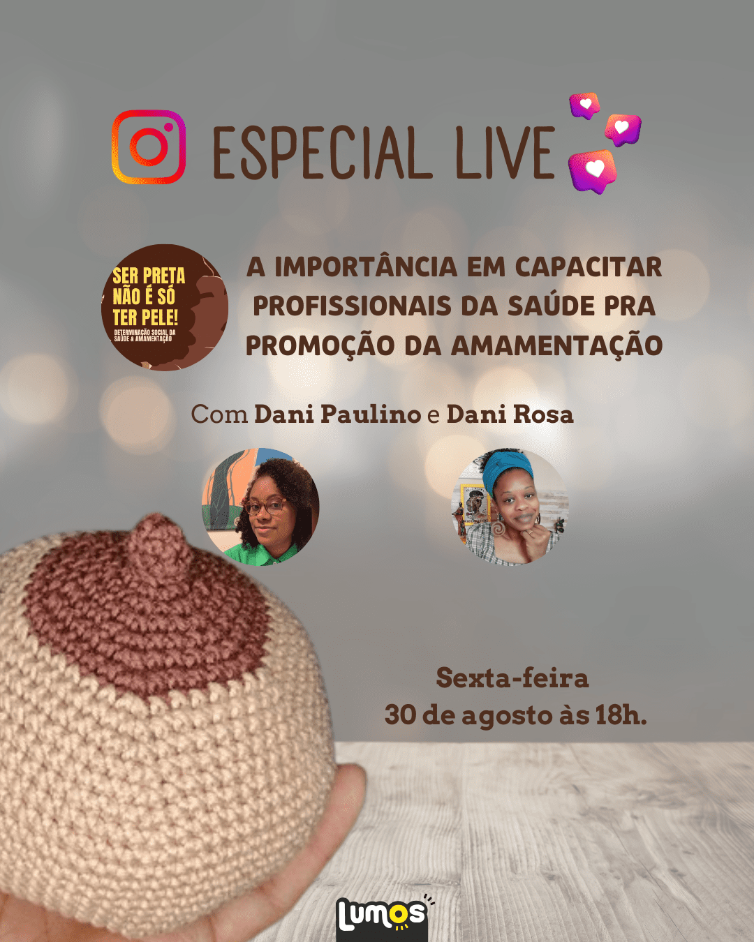 Dai 30 dando seguimento a Semana de Apoio à Amamentação Negra, no perfil da Lumos teremos a live sobre A Importância em Capacitar Profissionais da Saúde para a Promoção da Amamentação, com a Dani Paulino e a Dani Rosa, às 18h, esperamos você lá!