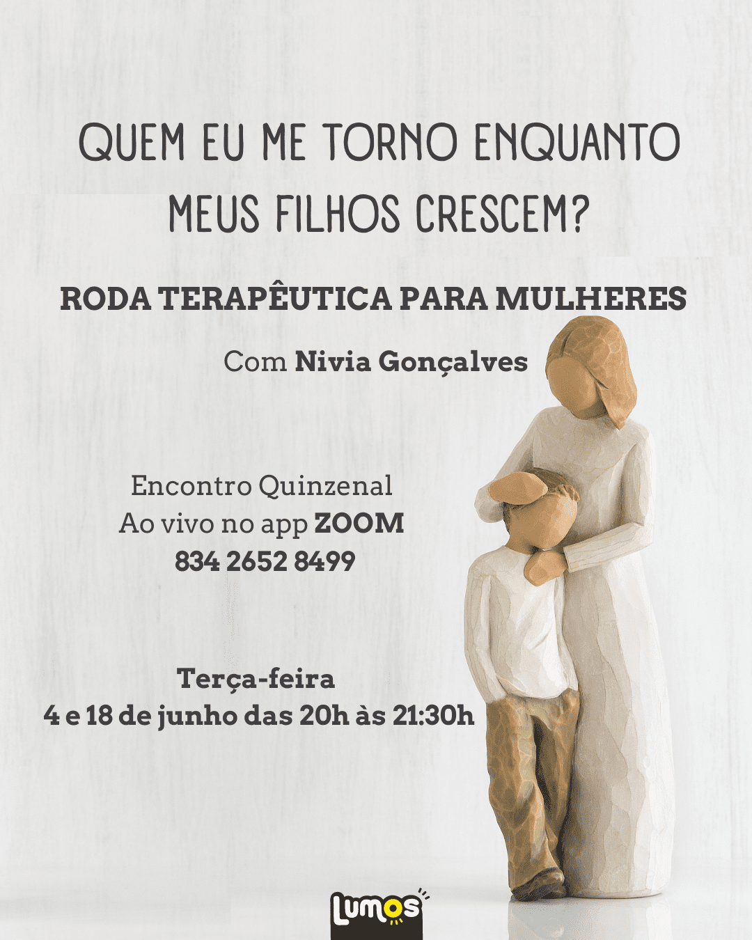 Quem eu me torno depois do furacão maternidade? Enquanto meus filhos crescem e se tornam independentes de mim, que novos desejos vejo brotar em mim? Que obstáculos e desafios encontro nesse caminho? Venha refletir com a gente, fazer novos planos, nossos encontros acontecem às terças quinzenalmente, às 20h. É só chegar!