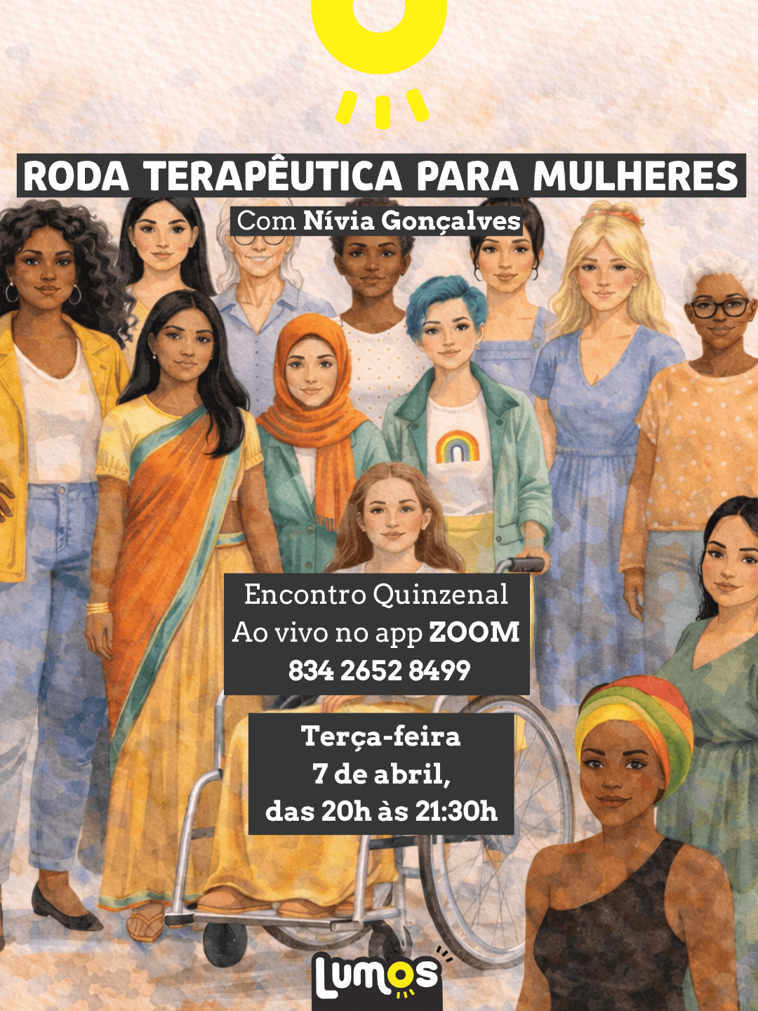 2. Acesse o link bit.ly/rodaterapeuticademulheres ou o ID da sala de reunião pelo app Zoom: 834 2652 8499